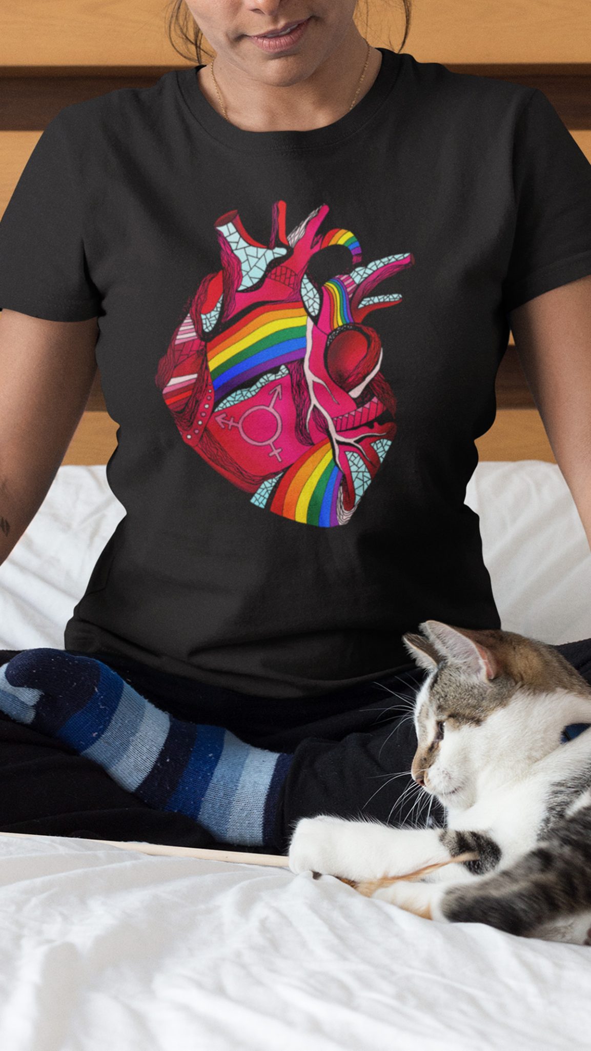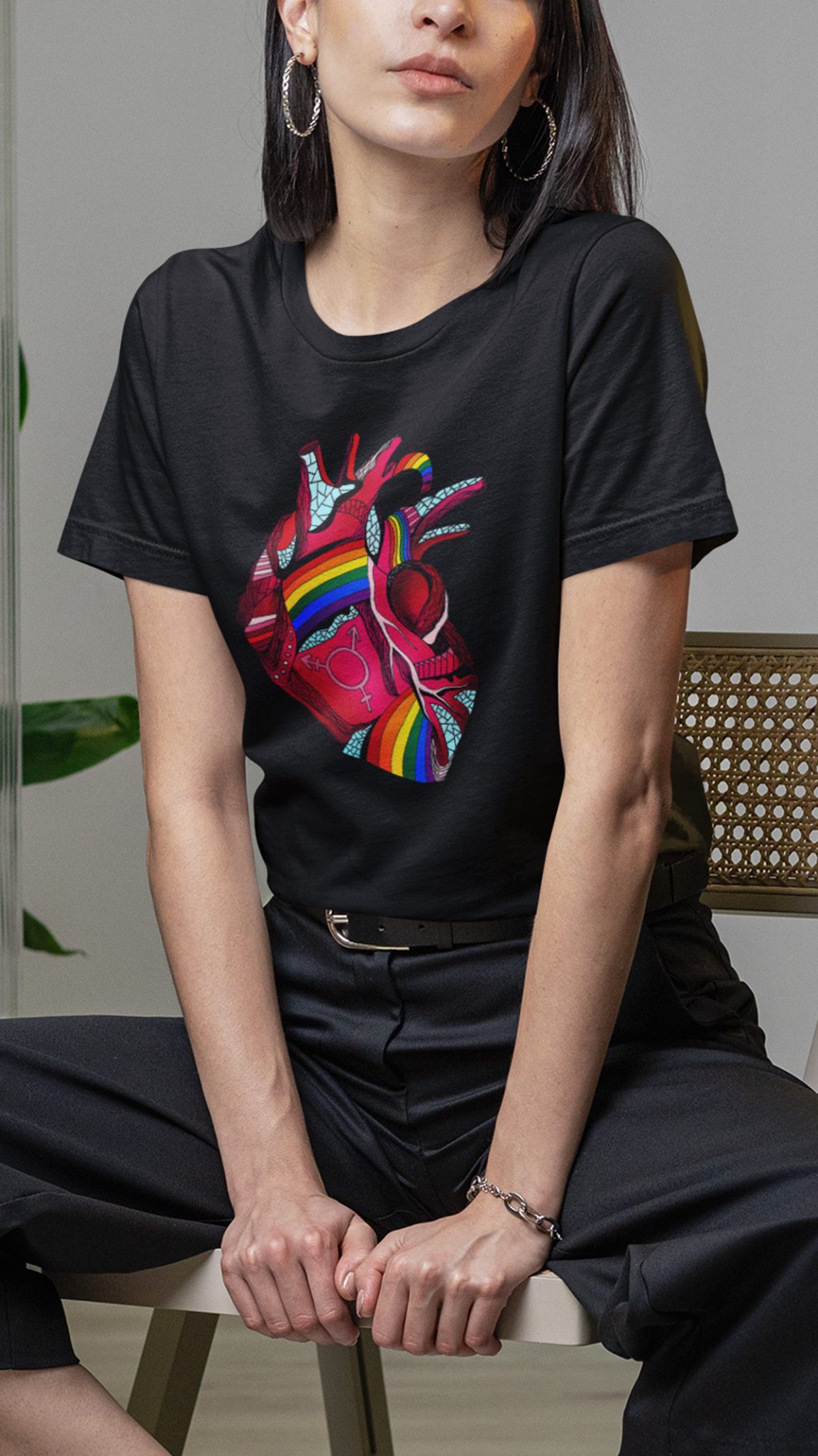 Unlike mass-produced pride shirt designs, this Pride Heart was drawn by hand with intention. The anatomical detail shows we're human. The rainbow arteries show love flows through everything we do. The gender symbols show love's infinite combinations.