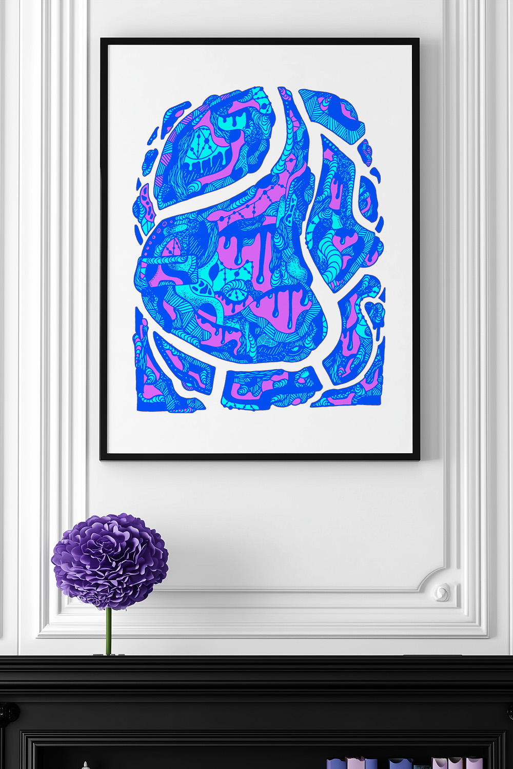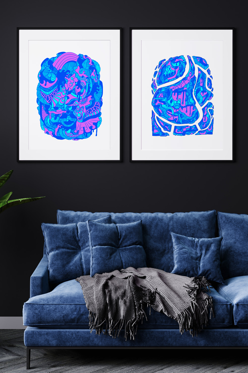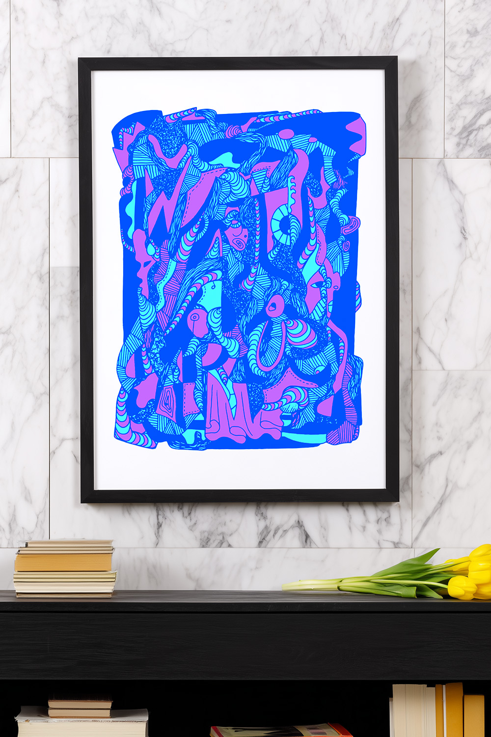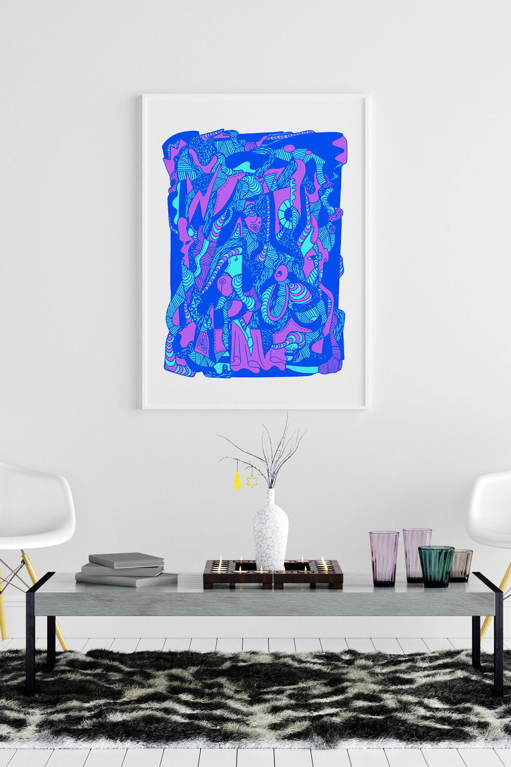 Each blue abstract art piece features vibrant blue ink work with pink accents, created entirely by hand using traditional pen and ink techniques. Available as premium art prints. Perfect for modern homes seeking original artwork that sparks conversation and inspires creativity. Limited quantities available.