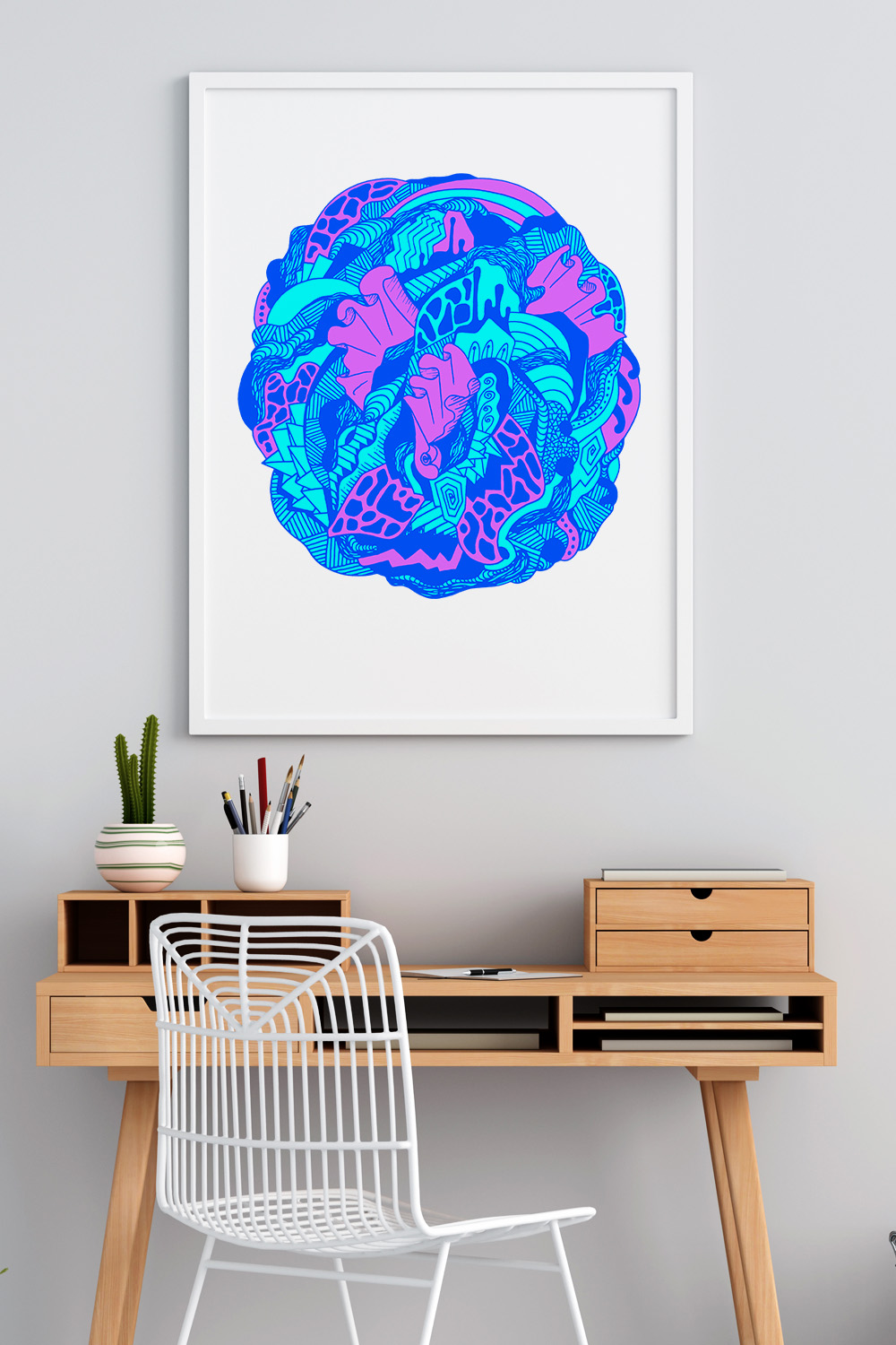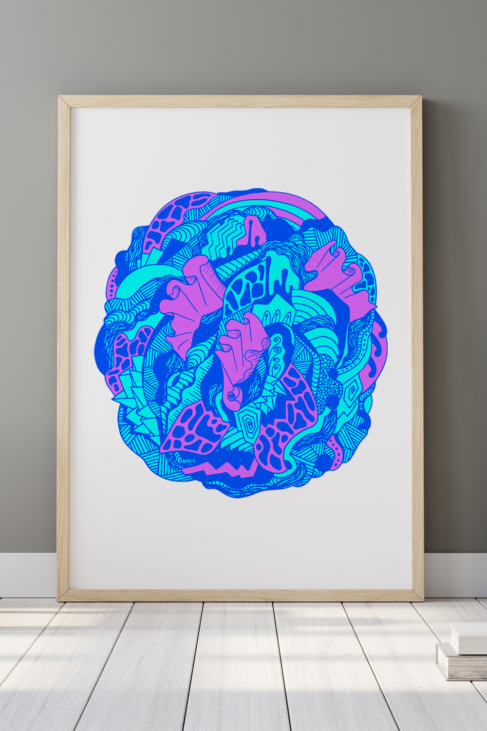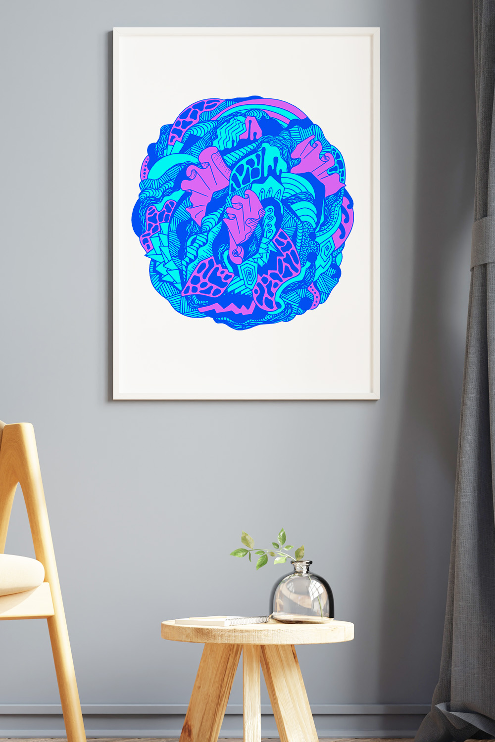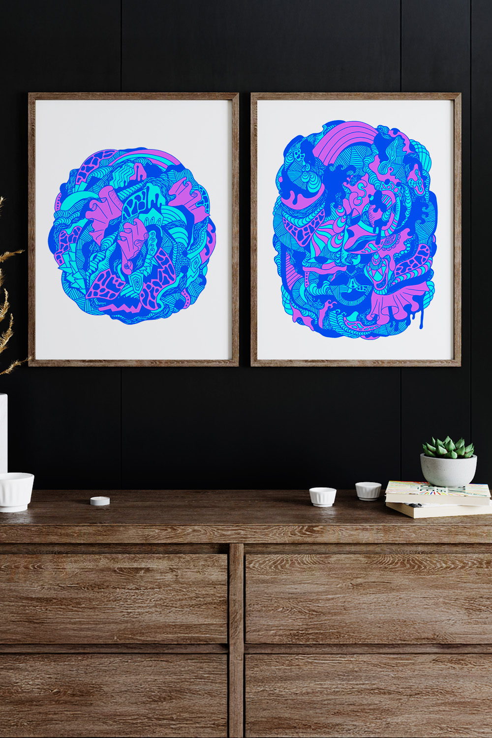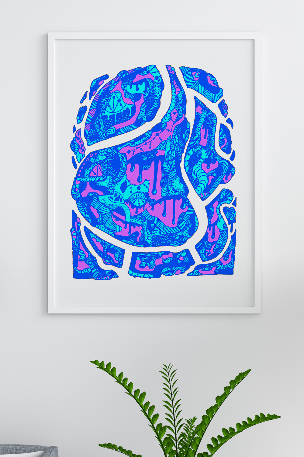 Each blue abstract art piece features vibrant blue ink work with pink accents, created entirely by hand using traditional pen and ink techniques. Available as premium art prints. Perfect for modern homes seeking original artwork that sparks conversation and inspires creativity. Limited quantities available.