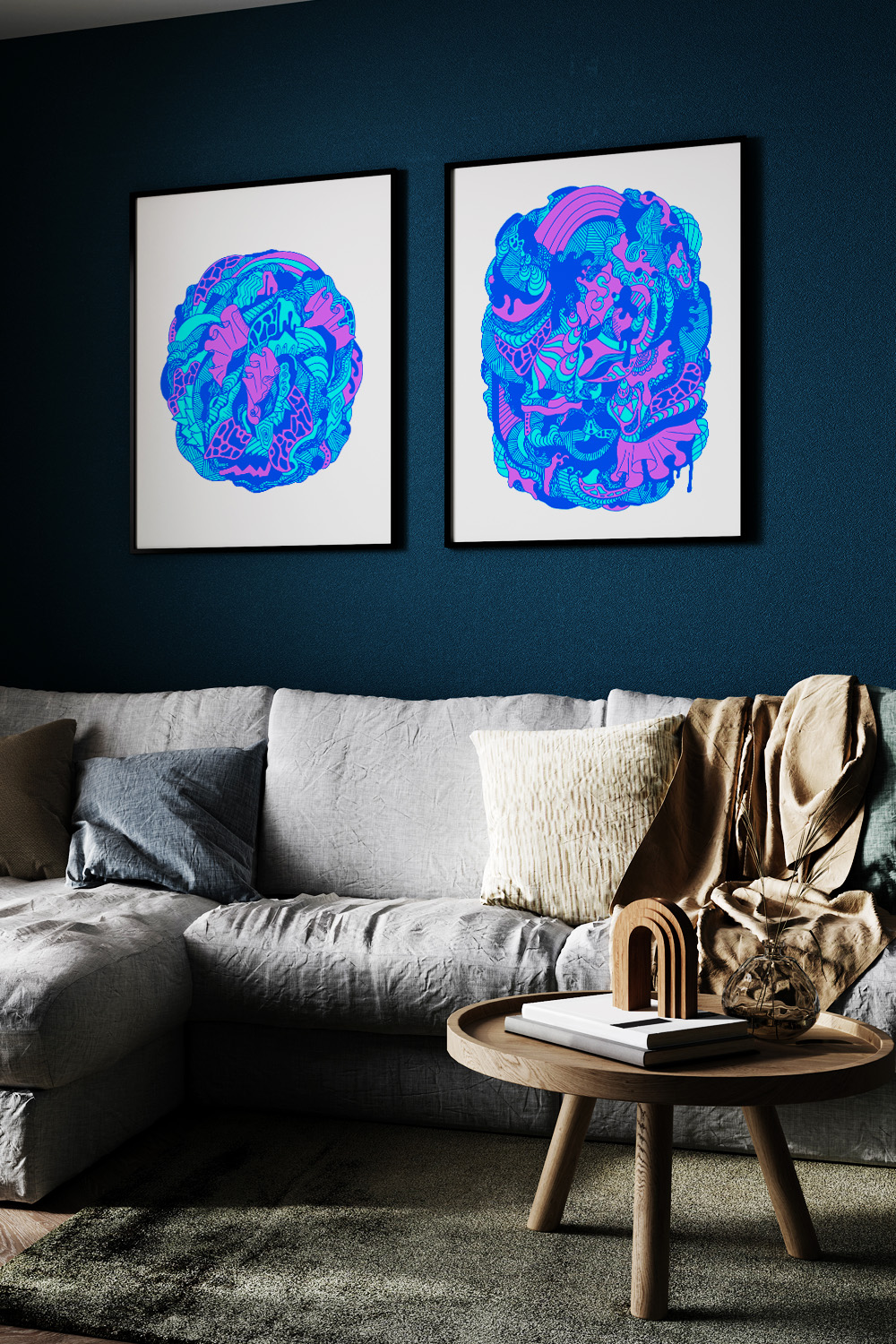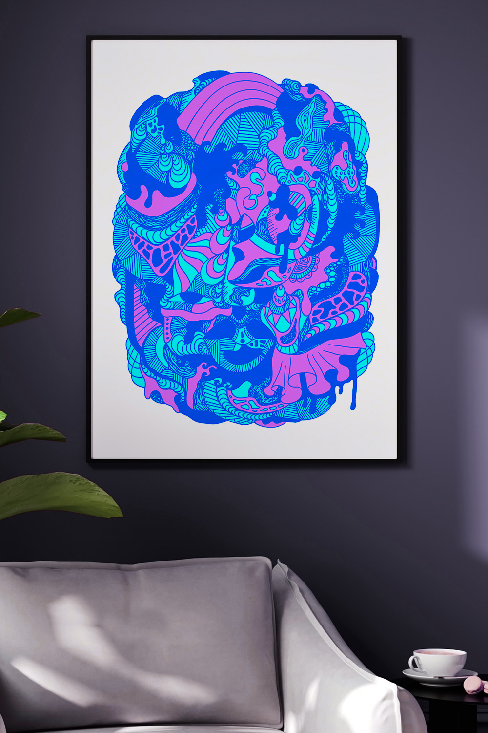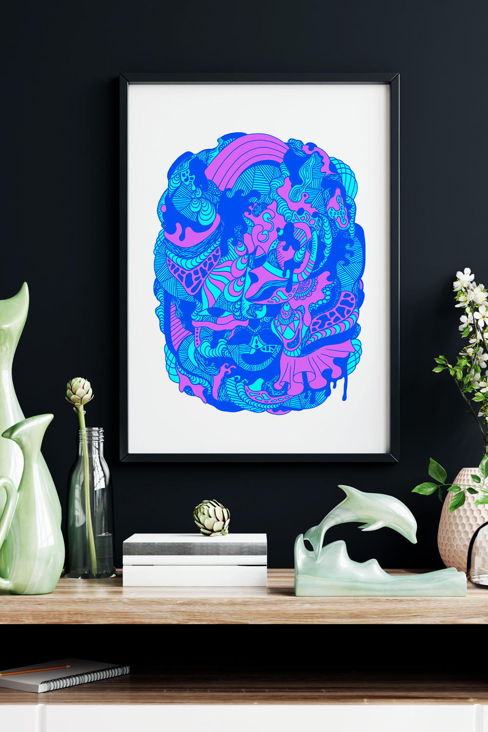 Each blue abstract art piece features vibrant blue ink work with pink accents, created entirely by hand using traditional pen and ink techniques. Available as premium art prints. Perfect for modern homes seeking original artwork that sparks conversation and inspires creativity. Limited quantities available.