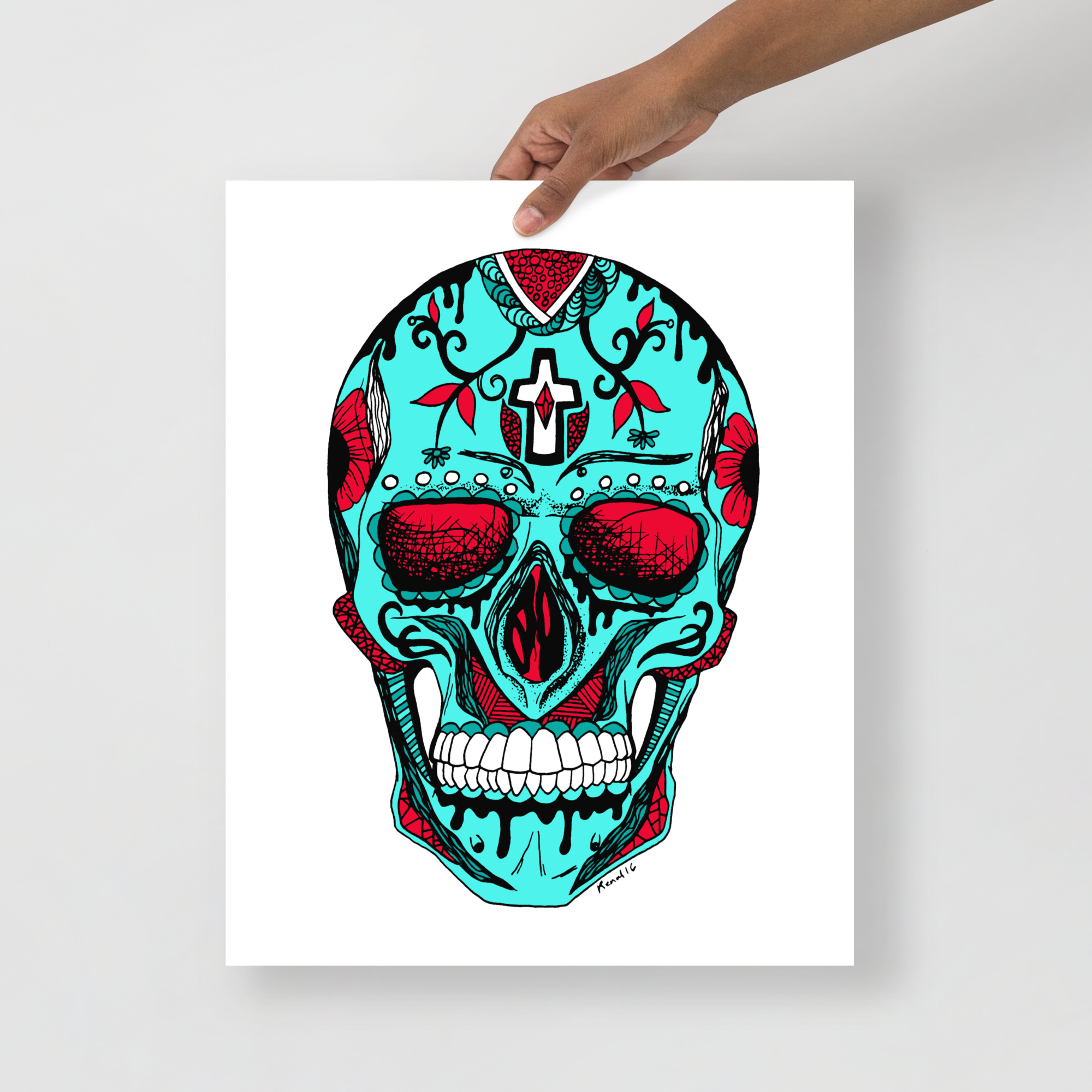 Turquoise Red Day of the Dead Skull Artwork “Los Muertos” Skull Drawing